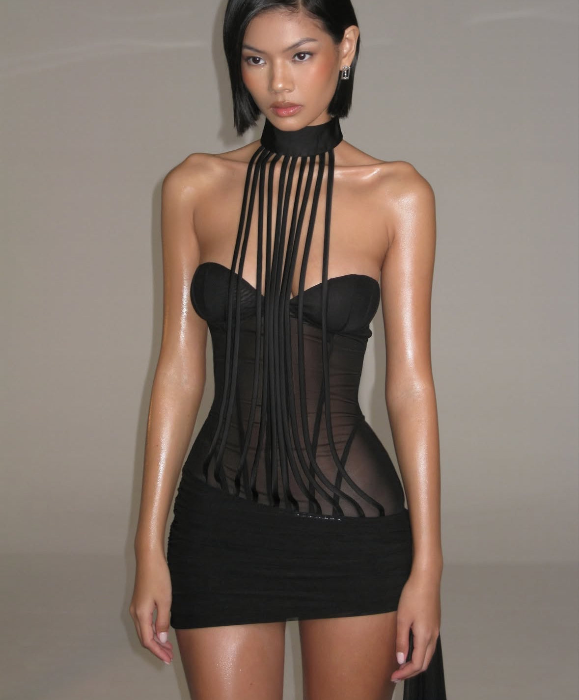 Turn heads in this striking black mini two-piece dress that's equal parts bold and breathtaking. The halter neck frames your shoulders beautifully while the fitted silhouette hugs your curves in all the right ways. A sheer mesh bodice with dramatic string accents creates an edgy, eye-catching look, while the ruched, lined skirt adds movement and dimension. Complete with a convenient back zip closure and a show-stopping floor-length side tail, this dress is your ticket to making a serious statement at any occasion.