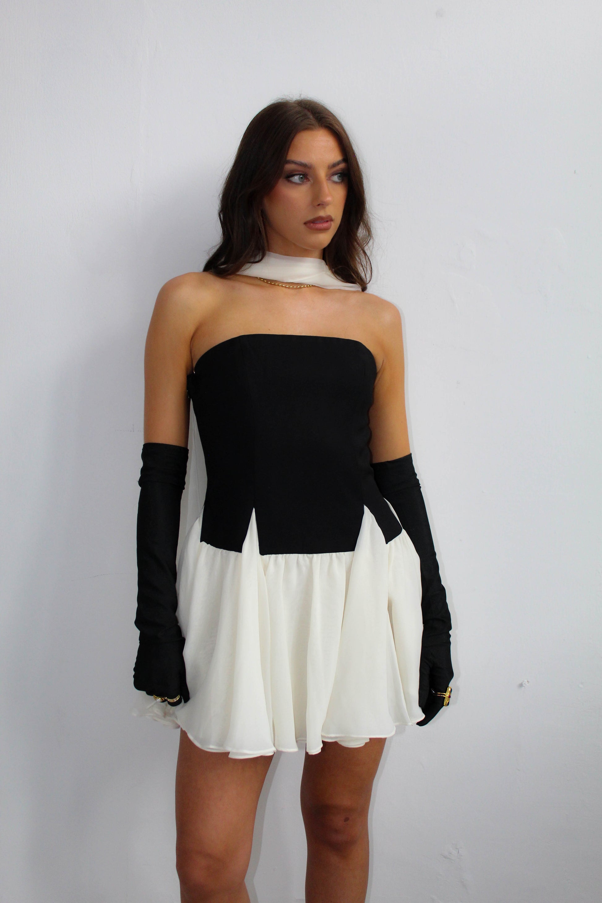 The Yia Dress is a vintage-inspired mini crafted with a wool-blend bodice and a floaty, three layered chiffon skirt. A modern take on a classic black-and-white silhouette, it features soft seam slits at the bodice and delicate chiffon that spills from the waist, creating a flattering shape. It also comes with chiffon scarf and gloves.